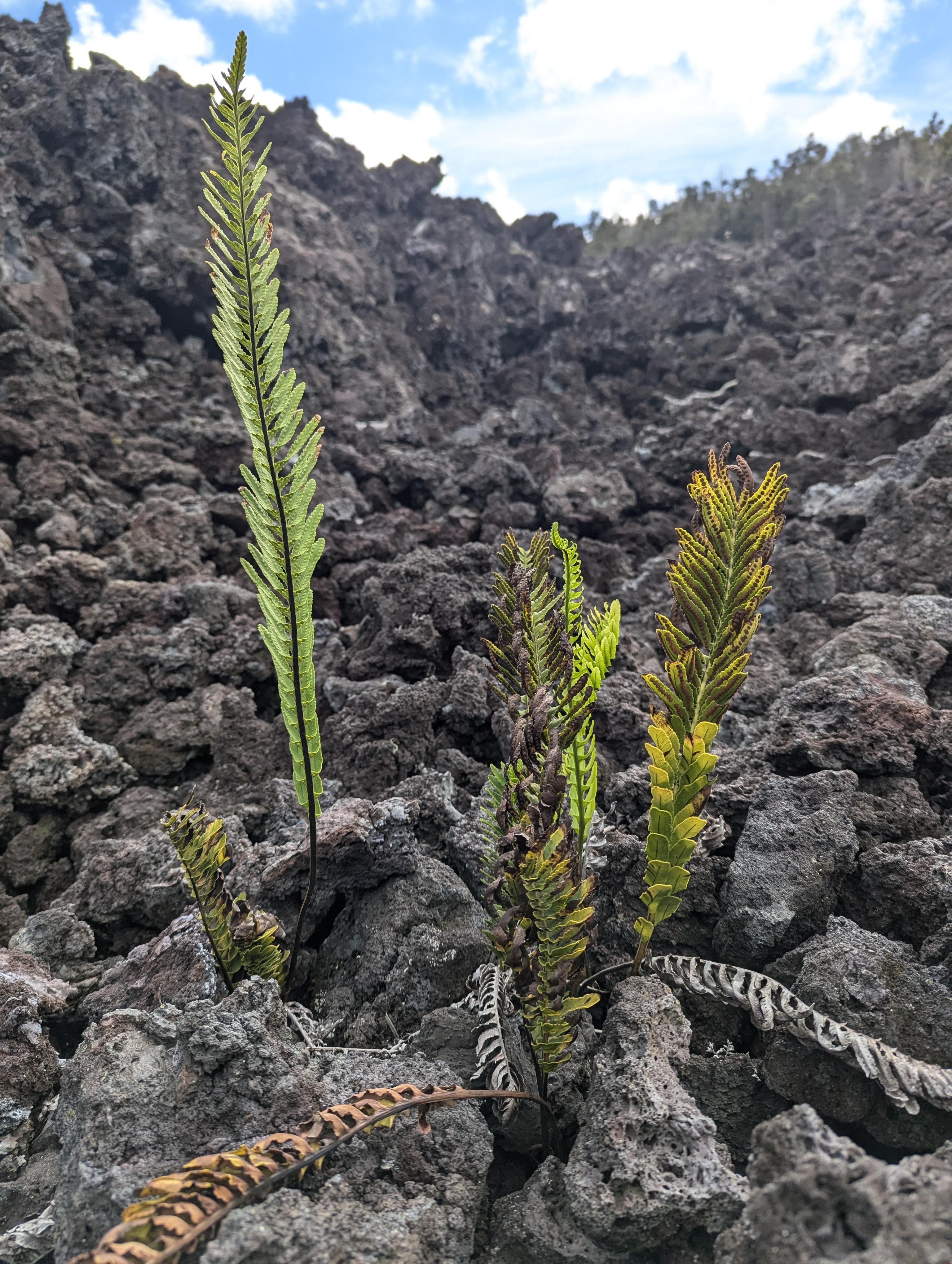Kilauea Iki, being the smaller crater next to the HBIC (Head Bitch in Charge), remained in a stable state and hikeable. From the lookouts on the Crater Rim, the crater floor looks the way you might expect it to look, having burned itself out and hardened into rock– charred, dead, featureless. But hoofing it out 400 feet below on ground zero under the scorching Hawaiian sun revealed a terrain that holds its own surprises and mysteries.